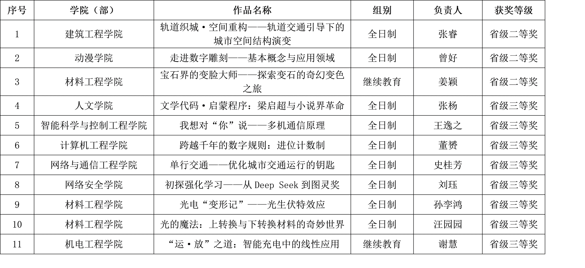 根据江苏省高等学校教育信息化研究会《关于公布2025年江苏省高校微课教学比赛获奖名单的通知》(苏高教信研〔2025〕8号)文件,我校有11项微课作品获奖,其中全日制组二等奖2项、三等奖7项;继续教育组二等奖1项、三等奖1项。